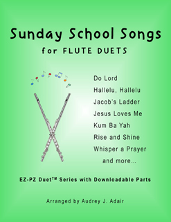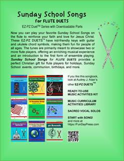 These Sunday School songs played as flute duets reinforce faith and love for Jesus Christ. Kids of all ages and adults will enjoy learning to play their favorites. The duets have kid-friendly arrangements and are in easy keys to play. 20 Sunday School Songs provides a perfect Christian gift for your flute player at Christmas, Easter, first communions, birthdays, and Sunday School events, as well as other occasions throughout the year.