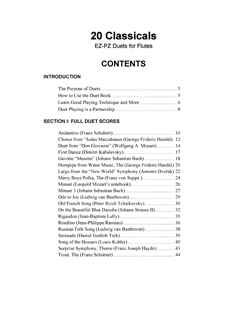 20 Classicals is a collection of diverse pieces by world renowned composers. These easy duet arrangements for flutes are true to the original works as possible and are sure to resonate pleasure for performers and audiences. Performing classical music has many benefits for beginner and intermediate flutists. One aspect is that it will advance your understanding of music theory. In most cases Part I can also be played as a solo.