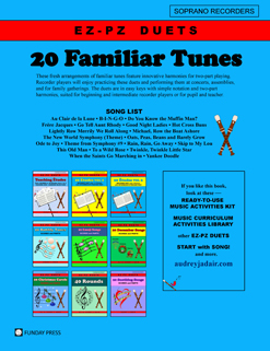 These fresh arrangements of familiar tunes feature innovative harmonies for two-part playing. Recorder players will enjoy practicing these duets and performing them at concerts, assemblies, and for family gatherings. The duets are in easy keys with simple notation, suited for beginner and intermediate recorder players or for pupil and teacher.